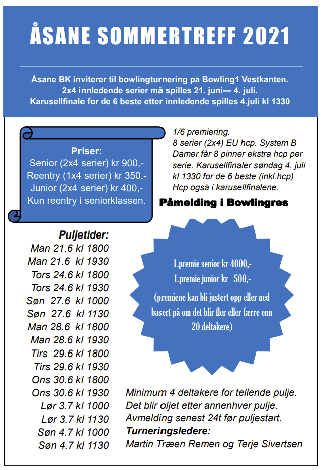 Åsane BK inviterer til bowlingturnering på Bowling1 Vestkanten. 2×4 innledende serier må spilles 21. juni – 4. juli. Karusellfinale for de 6 beste etter innledende spilles 4.juli kl 1330