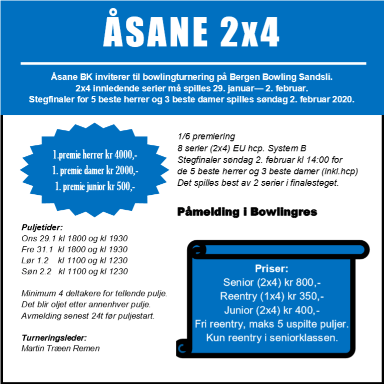 Åsane BK inviterer til Åsane 2×4 på Bergen Bowling Sandsli. 2×4 innledende serier spilles 29.januar til 2. februar. Stegfinaler dame og herreklasse 2.februar fra kl 1400