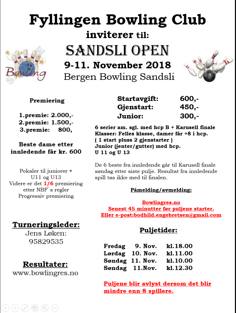 Fyllingen Bowling Club inviterer til Sandsli Open 9-11. November 2018. Hall: Bergen Bowling Sandsli