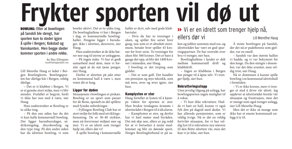 Det står en helside om Bowling i Fanaposten 18.juni 2021.